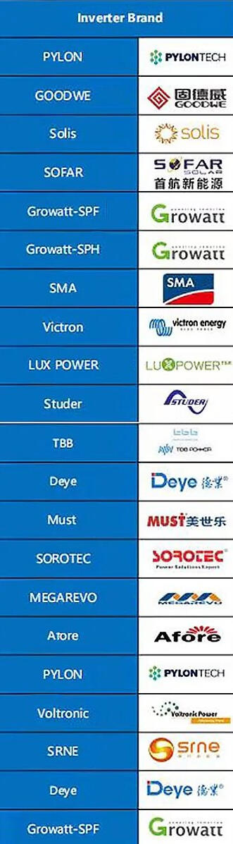 Les onduleurs recommandés sont DEYE/Sunsynk, Growatt, MPP / Voltronic et Victron. D’autres onduleurs compatibles sont listés ci-dessous. Notre équipe se fera également un plaisir de vous aider à construire votre propre système ! Vous ne serez jamais laissé seul.